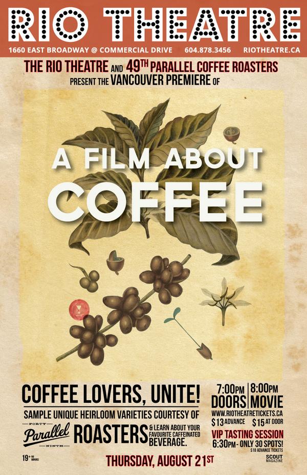 All coffee lovers you are invited to the Rio Theatre this Thursday, August 21st for the Vancouver premiere of the documentary a Film About Coffee. The film examines what defines specialty coffee and takes audiences around the world from farms in Honduras and Rwanda to coffee shops in Tokyo, Portland, Seattle, San Francisco and New York. You will see coffee through the eyes and experiences of farmers and baristas. The film offers an overview of all elements including processes, preferences and preparations as well as traditions old and new to create the best cup of Joe. This Thursday’s premiere is being brought to you by the Rio Theatre and Parallel 49 Roasters. For those wishing to taste as well, there is a VIP Tasting Session at 6:30 with limited spots available and $18 tickets. Doors open for the film at 7:00 pm and shows at 8:00 pm. Tickets are $13 in advance or $15 at the door.
