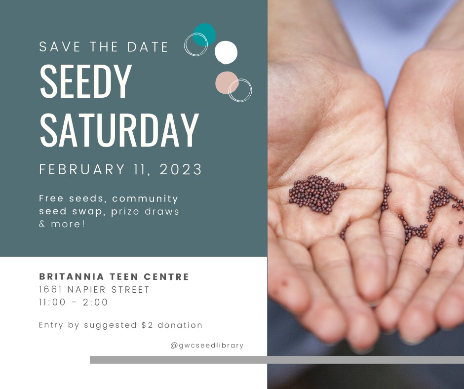 It may be cool outside, but if you’ve got the gardening bug, you will already be thinking about what plants you’d like to grow this Spring. There is no better time than now to start planning. Whether you are a novice or experienced gardener, you may wish to check out the upcoming Seedy Saturday hosted by the Grandview Woodland Community Seed Library. Their first event of the year happens Saturday, February 11th at the Britannia Teen Centre, 1661 Napier Street, from 11:00 am to 2:00 pm. There will be free seeds available to pick up or swap along with prizes and a draw. To learn more about this event and future events, visit www.gwcseedlibrary.wordpress.com.
